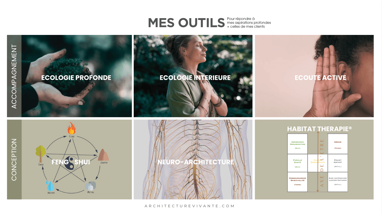 En 2012, j’ai développé une approche novatrice de l'Architecture axée sur écoute profonde et le bien-être des occupants. J’y ai intégré un service d’accompagnement et des outils de conceptions consciente tel que le Feng Shui, la Neuro-Architecture & l'Habitat Thérapie® pour offrir une réponse complète et holistique.